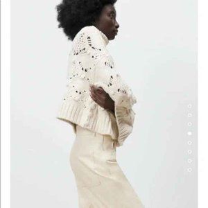 Brand new with tags, this ZARA cropped cable knit sweater with buttons is a favorite among bloggers! A sweater featuring a high collar, vented long sleeves, and buttoned cuffs, crafted from cable knit fabric. Size S.