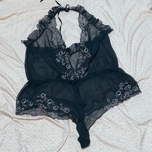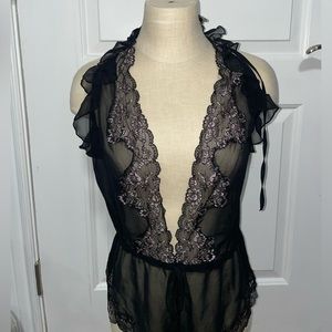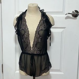 Worn once halter, deep v, sheer sleepwear it’s a loose fitting piece that has a drawstring for the waist. Shorts bottom