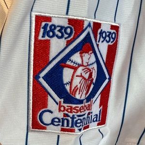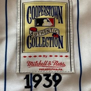 Patches include "Cooperstown Authentic Collection, Mitchell & Ness 1939), (1839 to 1939 to Baseball Centennial), (Joe DiMaggio),(NYC)