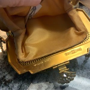 This is truly a sweet Whiting&Davis gold tone purse. It has a great crystal shell snap over closure. Has the original clean light peach satin interior. On the interior you will see the original Whiting&Davis signature, made in USA and the sewn in tag. This purse is small but is so cute with the crystal shell. All crystals are intact. See pictures. The gold tone chain handle measures a 3.5” drop. Measures 4.25x4”x.5”d. PLEASE SEE ALL PICTURES AND FEEL FREE TO ASK ANY QUESTIONS.