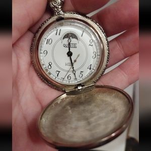 This vintage Quintel pocket watch boasts a beautiful silver etched floral design with a unique lunar phase feature. Made of durable brass material, this unisex adults' timepiece was manufactured in the 1970s and is a wonderful addition to any watch collection. It comes without original packaging, but is in excellent used condition with no personalized engravings or service records.