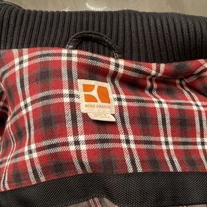 Boss Orange Thermore lined black leather jacket. Super warm. Soft leather. Beautiful detail. Size tag is missing. Looks like a medium. Shoulder to shoulder is 20". Underarm to underarm is 22". Length is 28". Sleeve length is 28"