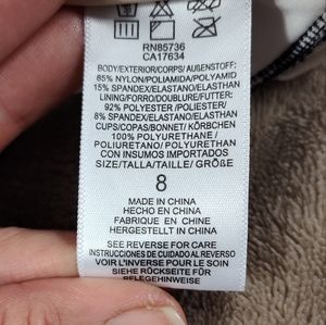 85% nylon, 15% spandex body; 92% polyester, 8% spandex lining.