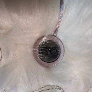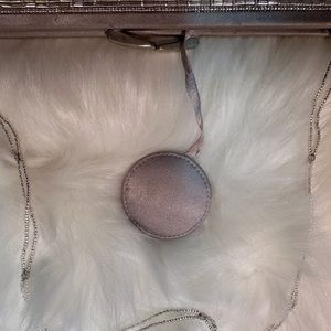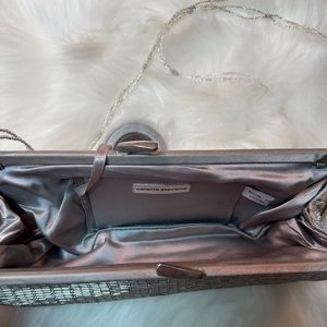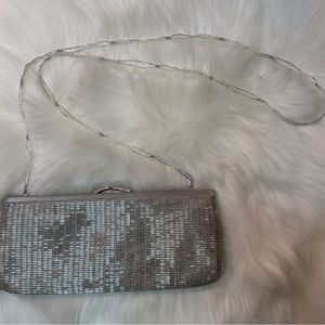 Beautiful beaded clutch with hidden beaded shoulder strap. Done in all silver tube beads with silver/gray lining . Has attached tiny mirror. Two small spots inside shown in pictures.