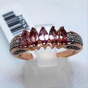 This ring is a stunner! Red Rose Apatite and Moissanite Ring in Vermeil Rose Gold Over Sterling Silver 2.50 ctwIntroducing this stunning red apatite ring. The red apatite center stone is the star of the show. The shank is also adorned with additional marquise-shaped moissanite, adding even more sparkle and glamour to this piece. This 925 sterling silver ring will make you feel confident and chic for any occasion.