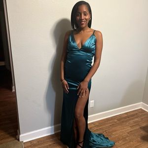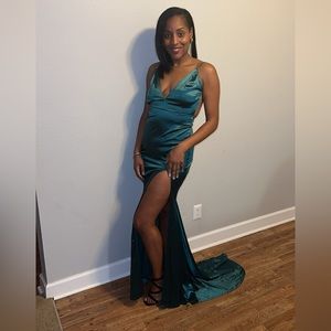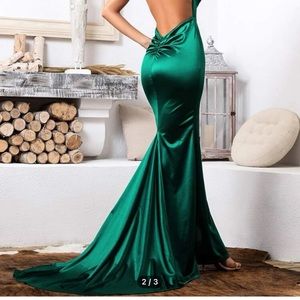 Backless formal dress with deep V neck.