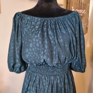 Sadie & Sage Blue Green Smocked Waist Balloon Puff Off The Shoulder Sleeve Lined Satin AOP Dress Womens Medium