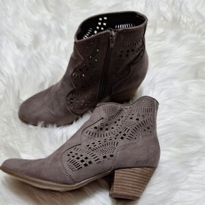 All leather black boots the heel measures 3 in tall. They have a beautiful buckle accent. They are a very stylish pair of boots. In great shape