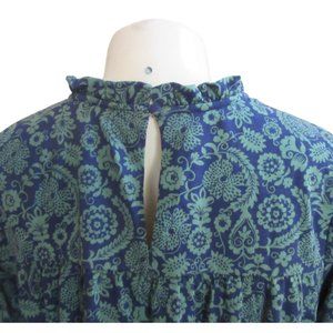 Boden paisley dress. Green Design on a navy blue background. In size 6L US. Pullover dress that has a little button on the top in the back. Extra button is found on the tag inside. The dress is made of 48 percent cotton and 52 percent modal. Modal is a bio-based fabric that is made from spinning beech tree cellulose. Eco friendly. Long sleeves with elastic and ruffle at the bottom of the sleeve. Small tie belt is found on the dress.