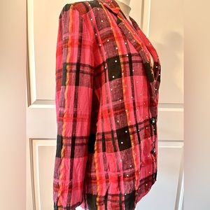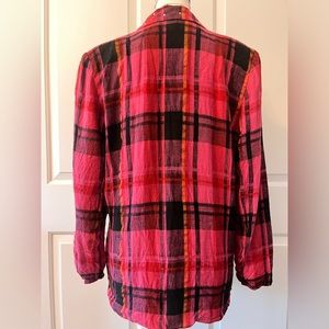 Size Medium. Pink/red/orange/black madras plaid with crystal embellishment detail. A cute, fun, feminine and very unique piece. This is in great preowned vintage condition, the interior lining’s seam does have a small rip, which can be seen in the pictures. This is the only imperfection I notice. The exterior of the jacket shows no flaws. Two button front.70% rayon, 30% linen. Made in the USA