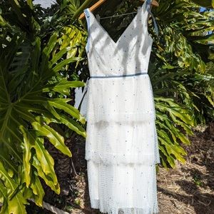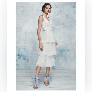 Gorgeous midi length Marchesa Notte dress, with white tulle ruffles and light blue embroidered details. This is a perfect rehearsal dinner dress, but we opted for a non traditional rehearsal so I never got a chance to wear it!