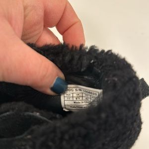 These are a great pair of black suede Ugg boots. Wooden high heel, lace up. Size 11.