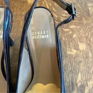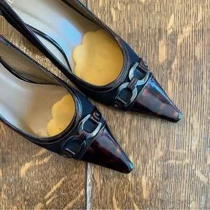 Vintage Stuart Weitzman black and brown low-heeled slingbacks. Buckle and tortuous-shell detail. These vintage shoes remain intact with their previous owner’s foot cushions, which you may choose to remove on your own. Otherwise great condition.