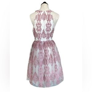 Chi Chi London NEW Pink Embroidered Metallic Tulle Halter Dress Vintage Inspired Princess Dress. White bodice and mesh overlay of embroidered rose pink lace in baroque/damask pattern. High neck, tulle skirt, fit and flare style. Back Zipper, Lined, Padded Cups.