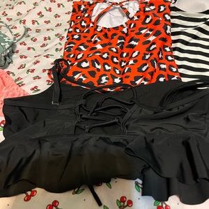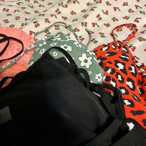 Lot of swimwear, bottoms, tops, suit, and a cover-up. All of them are a size medium except the black and white striped top is a small. I believe all of these came from Shein and one from Walmart (the coverup). They are in good used condition.