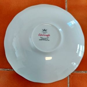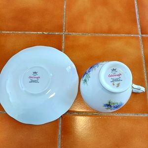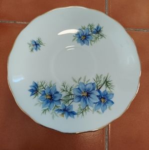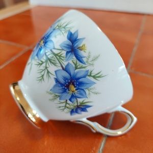 Very beautiful Vintage Colclough by Ridgway Potteries England Bone China Footed Tea Cup & Saucer, Features Bright Blue Flowers & Green foliage w Gold trim, Size: Saucer: 5.5", Tea Cup: 3.5"×3"H, Very small manufacturing defect on the Bottom of the Saucer, No chips or cracks