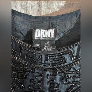 Vintage DKNY Black Silk Beaded Dress Size 10. Beautiful beaded detail. Beading on the top right shoulder has come undone (shown in photos). Doesn’t stand out when worn due to the black-on-black beading. Overall great vintage condition for age. 100% Silk