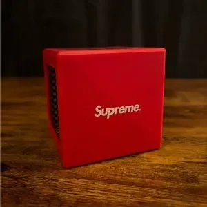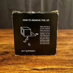 This Illusion Coin by Supreme is colored in Bank Red, and it features a simple cubic design with an opening on the top for bank deposits. The product is mostly red, with contrast provided by the 3D graphic plastered at the front. For branding, there is the classic Supreme logo displayed in white and red, plastered on the sides.
