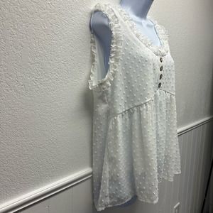 Details: Lining fabric has nice stretch. Delicate ruffled neckline & sleeveless trim. Non-functional Buttons.