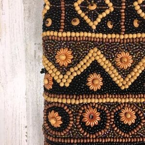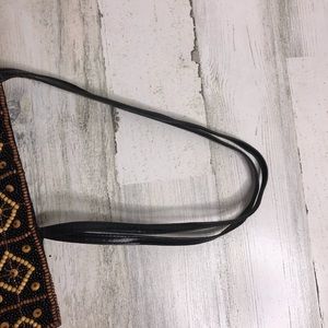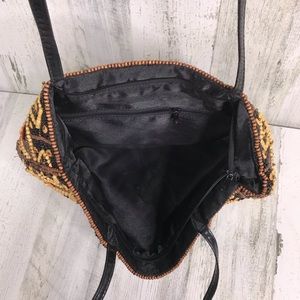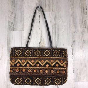 bohemian boho beaded cloth bag with leather handles and satin liner