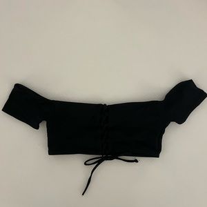 Lspace swimsuit top black, off the shoulder, has a tie going through the front, very flattering, has been worn, in good condition