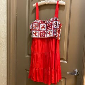 New York and Company summer beach dress. Trendy crochet granny square top with tiered bottom. Fully lined with side zipper. Fits true to size.