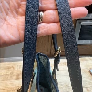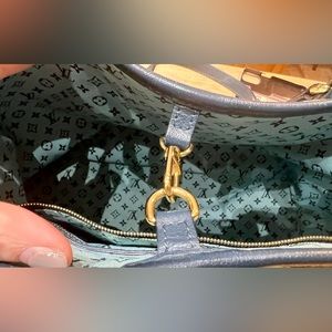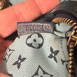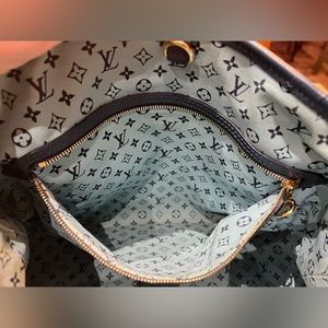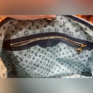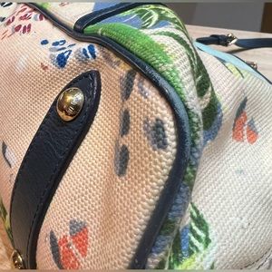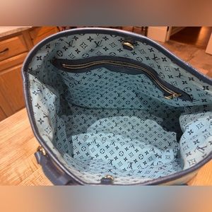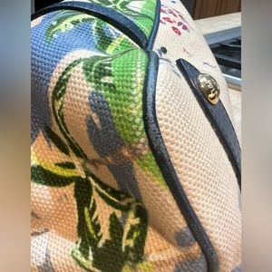 The canvas is clean and in beautiful condition. The leather piping around the base has some minor fading at the corners. The metal feet have surface scratches at the center. The handles show slight creasing with very light wear along the glazed edges. The hardware is crisp and bright with some very light hairline scratches. The interior is clean and in excellent condition throughout.