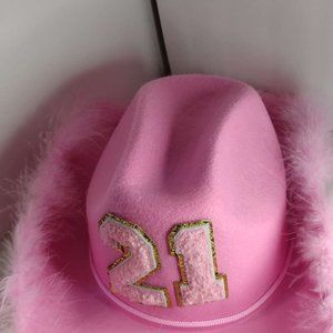 NEW 21 Birthday Cowgirl Hat with Fluffy Feathers Glasses Novelty Cowboy pink Hat