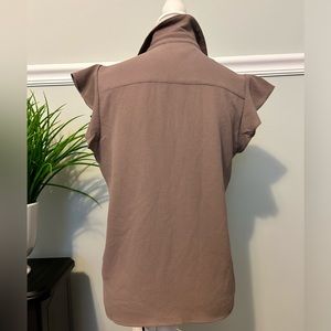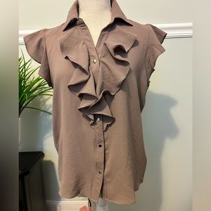 Flutter front detail is framed by matching flutter sleeves, cool and whimsical shirt for running errands or casual day in the office