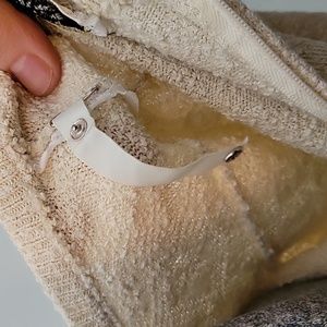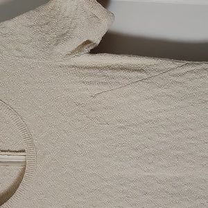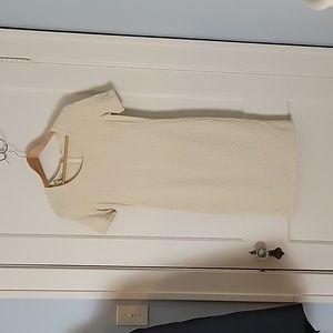 Classic vintage knit pencil dress is a linen/wool blend. Back zip with hook and eye and darts at side bust for fit. Bumpy knit fabric is creme color with diamond weave detail. No flaws that i saw knit has some give, as knits do.