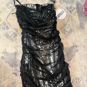 Stain long gown with rhinestown detail straps.