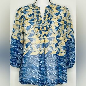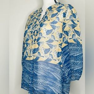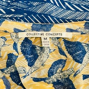 COLLECTIVE CONCEPTS Sz M Golden Yellow/Blue Birds Print 3/4 Sleeve Women Blouse