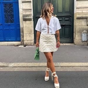 Matching ecru embroidered set for summer wardrobe with stylish linen mini skirt and blouse.
