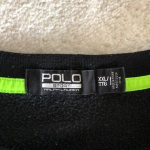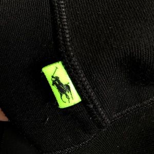 Black Polo Sport Crewneck sweatshirt with white and lime green logo. Perfect for wearing casually with jeans or with active wear. Good used condition. No rips stains or holes. Light pilling throughout.
