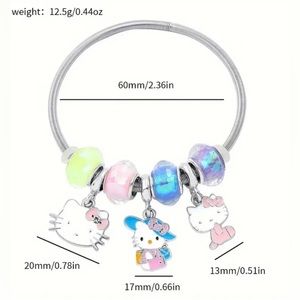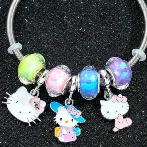 Adorable stretch charm bracelet with Hello Kitty charms and colorful beads! The bracelet includes 3 distinct charms and 4 multicolored beads.