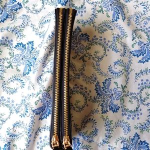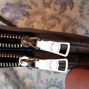 NWOT Coach double corner zip wallet, medium brown signature coated canvas with gold hardware. Lined in black fabric (though it looks brown in photos). One side has 3 long open pockets, other side has 1 open pocket, 6 credit card slots. Leather tag. Can fit a phone and tons of other stuff.