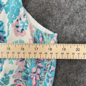 This Talbots Fresco Paisley Sheath Dress in size 14P is a stylish and versatile addition to any woman's wardrobe. The dress features a beautiful paisley pattern in teal blue and pink, with a sleeveless design that is perfect for warmer weather. The knee-length dress is made from high-quality materials and is in great shape.