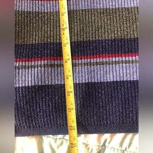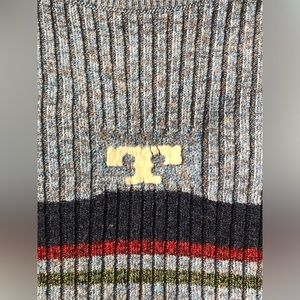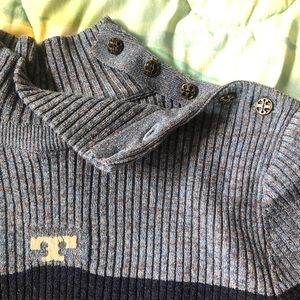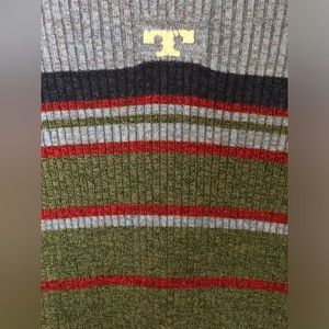 Tory Burch multicolor striped sweater size small. Buttons up the side of the neck, the ‘T’ logo on the from has 2 cracks on on side of the T. It’s a stretchy sweater, here are the measurements :