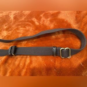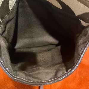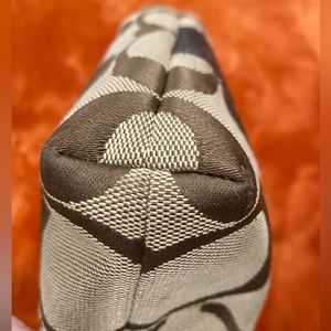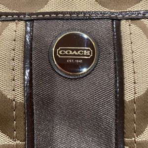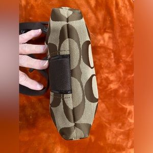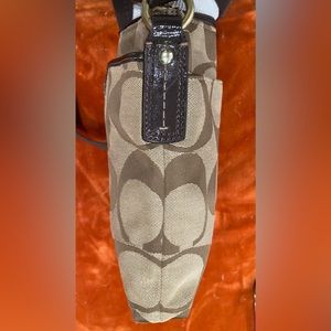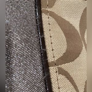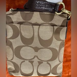 Brown, and tan with gold tone hardware. It has a long adjustable strap. Pockets in front and back. Zipper closure, inside pocket. It measures approximately 9 X 8 inches, adjustable crossbody strap. A snag and a small spot on left corner, and a few threads in front all in pictures. Clean inside and out. Used a few times. Only owner.