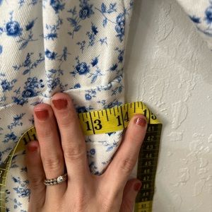 White fitted cotton corduroy like dress with blue flower pattern and puff sleeves. Has open back with button closure and hidden back zipper. Perfect for Fall or Spring weather! Please see measurements and material.