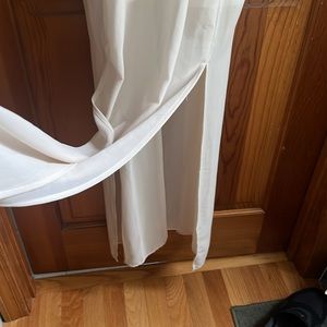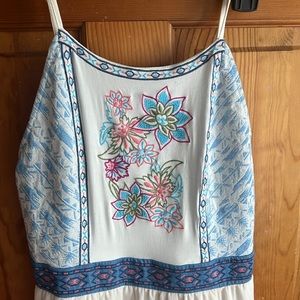Flying Tomato cream and blue maxi dress. Adjustable shoulder straps and shirted elastic back. Skirt is lined to the knee area. Split hem. Embroidered with flowers on front. Geometric waistband. Size large. Measures approx 16.5” armpit to armpit and stretches to 19”. Excellent condition. Comes from a smoke-free and pet free home.