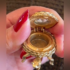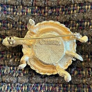 *Turtle two is a SARAHCOV signed solid perfume holder brooch. Goldtone with unique rope-like detail surrounding a bronze colored glass stone. Excellent condition, no perfume included.