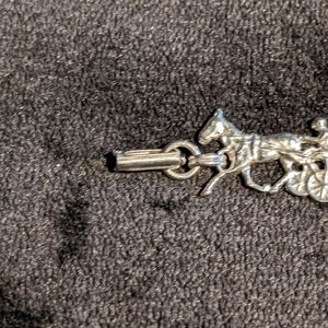 This unique vintage silver tone bracelet features 5 Harness Racing Sulky Wheel Trotters. Excellent preloved Vintage Condition.