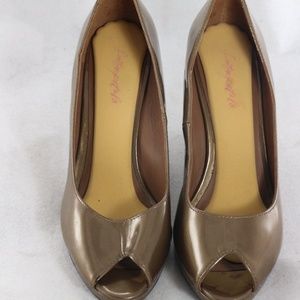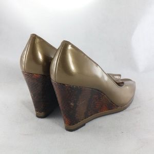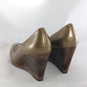 Excellent condition on this exotic wedge of a peep-toe pump in pearlized patent leather. No stains, spots, tears, scuffs, holes, fade, or discoloration. Smoke and pet free.