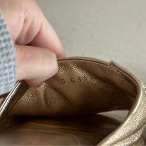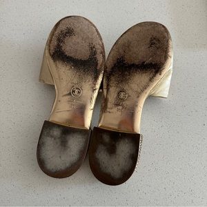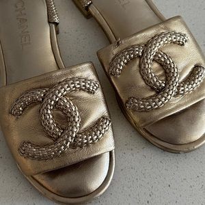 100% authentic, gorgeous Chanel gold slides! Please note these are NOT new, please see photos for all flaws. Once they are on, the flaws are not noticeable and look fantastic but closer up you can see they have scuffs and a small tear on the top. Totally wearable and have lots of life left! I’m sure a leather craftsman could repair the tear, but I have not tried, so I’ve priced them accordingly. These were my absolute favorite sandals for a while, they are beyond comfortable with a very soft cushioned footbed and the leather is perfectly worn in! These are not sold anymore, totally out of stock and hard to find!