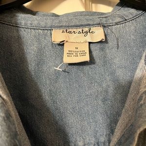 Star Style denim tunic top/dress. Two front pockets and distressed holes in front and back. Three quarter sleeves with fringe. Size 1X. Approximately 40 inches from shoulder to hem.