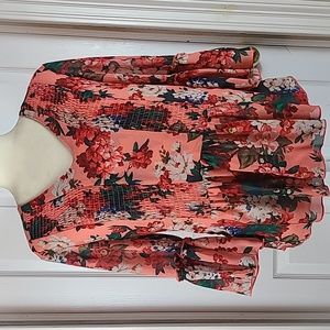 Long Sleeve, Button Down Blouse, Has Hidden Buttons, Semi Sheer, Burgandy With Blue and White Floral Print, Size Large.