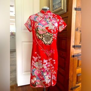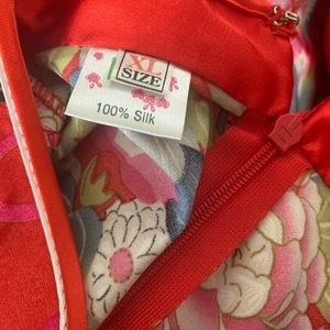 NK 100% Silk Dress. Traditional Chinese Cheongsam Mandarin Gown with flower designs, frog closures, slits, back zipper, red trim and a standing collar.