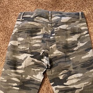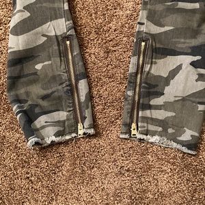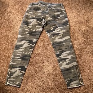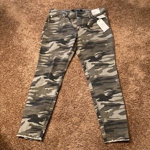 EXPRESS. Women’s brand new camouflage ankle legging pant. This is a mid rise. Pant with stretch. Size 8 regular. Retails for $79. These are very nice pants. They have gold zippers at the ankles. Very sharp looking. They have five pockets and belt loops. Laying flat, the waist measures 16 inches. The inseam measures 28 inches. They have a raw hem. NWT