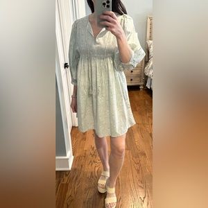 Boho oversized midi dress with tassels. Sage mint blue green with off white print. Indian print vibe, leaves and fruit (pomegranate?). Puffy sleeves with button that fall just past elbow on most. 100% cotton, very lightweight. Brand new. Size small but will very easy fit a medium or even a large (if small to medium chest, I’d say can size down, if larger chest, true to size). Length 35” (falls above knee length on 5’6” person). Bargain price! Boutique brand. Unique find, no longer sold.